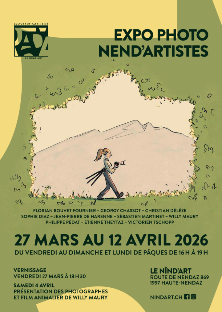 A ne pas manquer Exposition temporaire:Michel Favre – Sculptures 21 janvier au 21 juin 2026 Musée des sciences de la terre Sébastien Martiinet expose à NEND’ARTISTEs 27 mars au 12 avril 2026 Information sur l’exposition 29 ème exposition Photoclub Gland 14 au 22 mars 2026 1er festival photo Saint Sergue 14 et 15 mars 2026 Domestique photogénique Médiathèque Valais Martigny Durée de l’exposition 23. Mai 2025 au 28. Mars 2026 Vernissage 22.05.2025 à 18:00 Ouvert les jours suivants Lundi, 13:00-18:00 Mardi, 13:00-18:00 Mercredi, 13:00-18:00 Jeudi, 10:00-18:00 Vendredi, 13:00-18:00 Samedi, 13:00-18:00